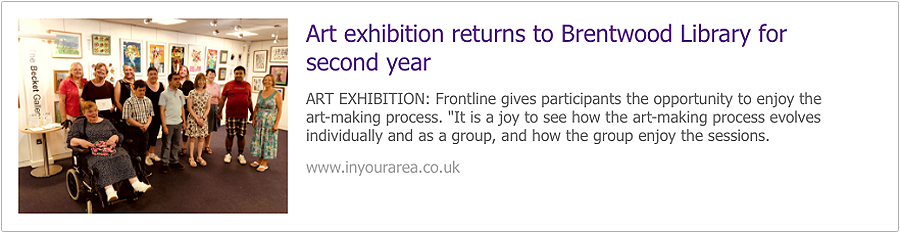 The Brentwood Arts Therapy Centre opens a space for Artists with special needs to display their work for free. Frontline's Café Art participants are on show. Artworks are for sale and the money to go to the Artist and also to the Charity in context. It’s a double way to help the community. Please come along to see the display.