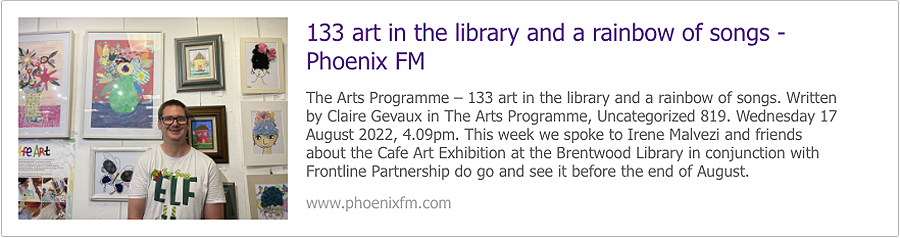 There was a Radio interview with Irene Malvezi on The Arts Programme 76 – Phoenix PM on the 8th of August 2021 promoting Brentwood Art Trail at The Gates. Here is the link and it starts in the 43 minute along the line.